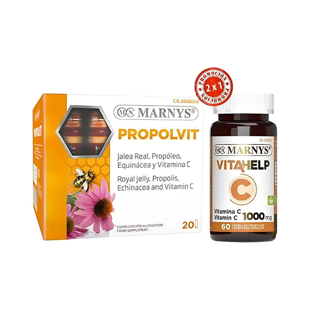 PROPOLVIT: Acqua deionizzata, frutta, gel reale (1000 mg), concentrato di echinacea viola (150 mg), propoli purificata (100 mg), vitamina C (20 mg - 25% RDI), aroma e conservante.