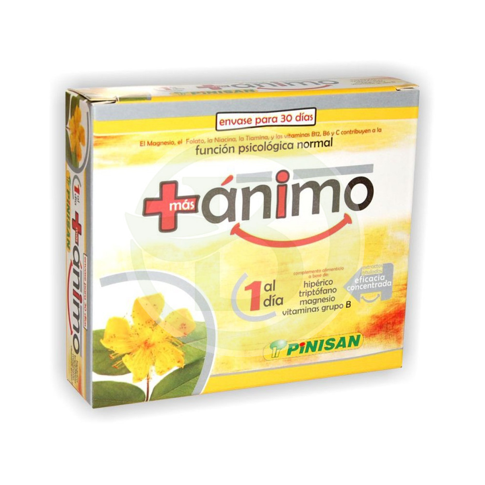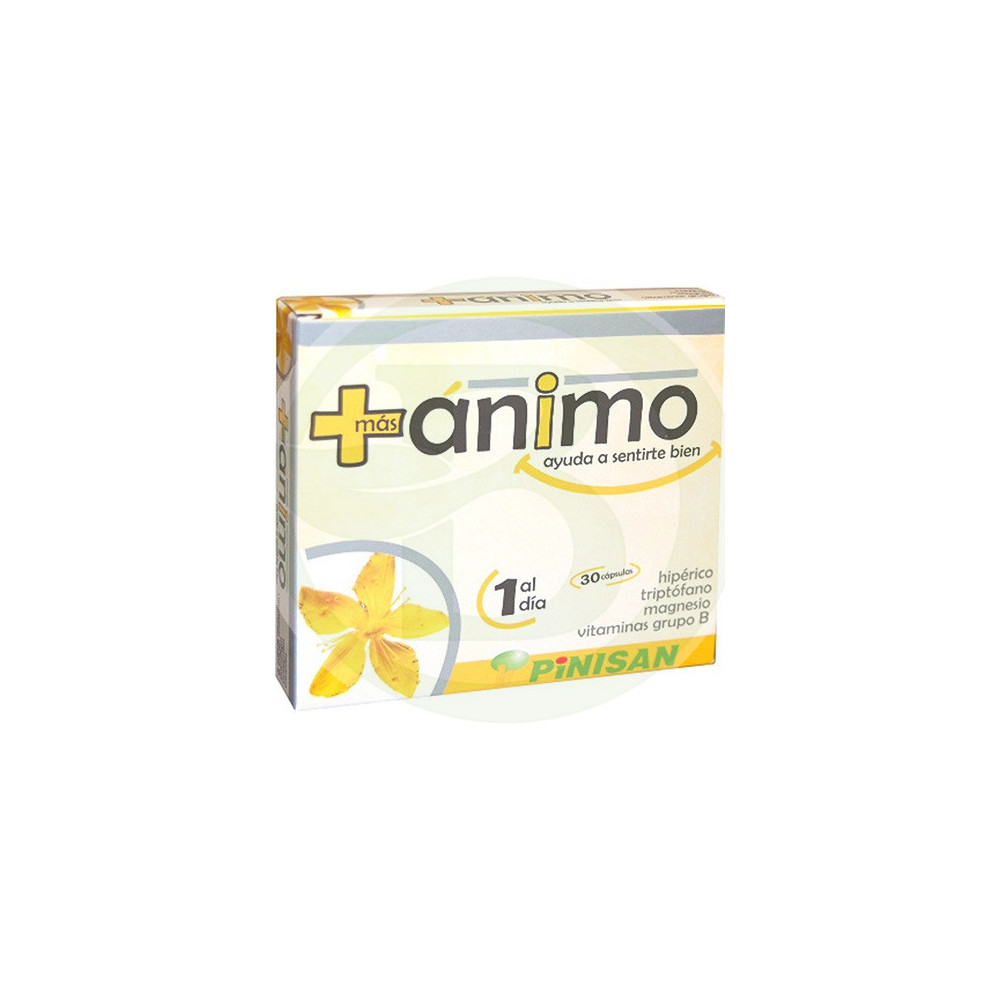 Más Ánimo 30 cápsulas de Pinisan, no contiene gluten, ni azúcares añadidos, ayuda en su día a día a mejorar su estado anímico.