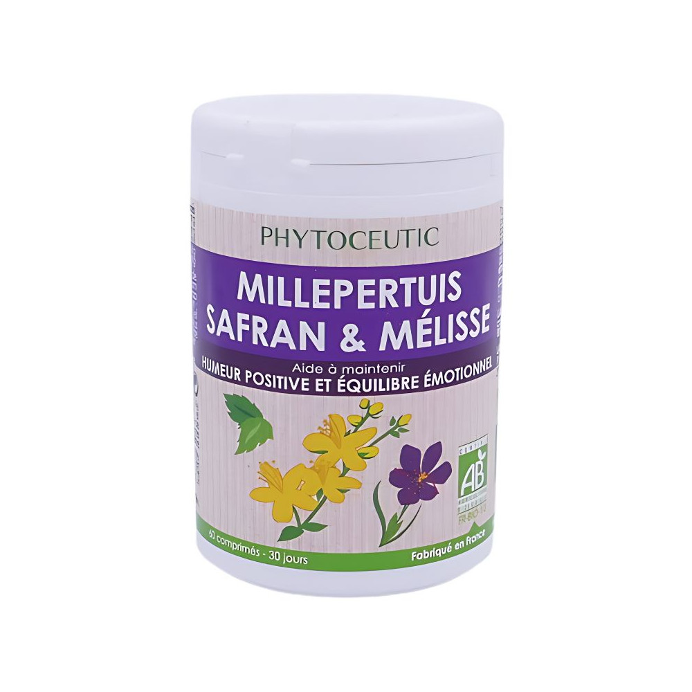 Per 2 compresse: erva de São João (Hypericum perforatum), estratto BIO......700 mg di açafrão (Crocus sativus), estratto BIO.............. ..30 mg Erva-cidreira (Melissa officinalis), estratto BIO.................20 mg amido di grano talpa, sciroppo di riso, stabilizzante (citrato di calcio), agenti antiagglomeranti (carbonato di magnesio, anidride carbonica di silicio), olio di semi di girasole, zafferano, agente di supporto: amido di grano duro. *Contiene grano.