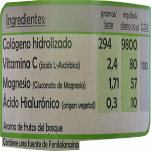 Ingredientes: col?geno hidrolizado 9.800mg, vitamina C (?cido L-Asc?rbico) 80mg, magnesio 57mg, ?cido hialur?nico 10mg.