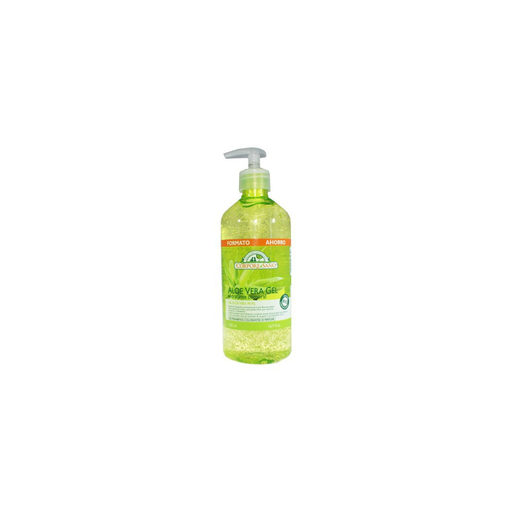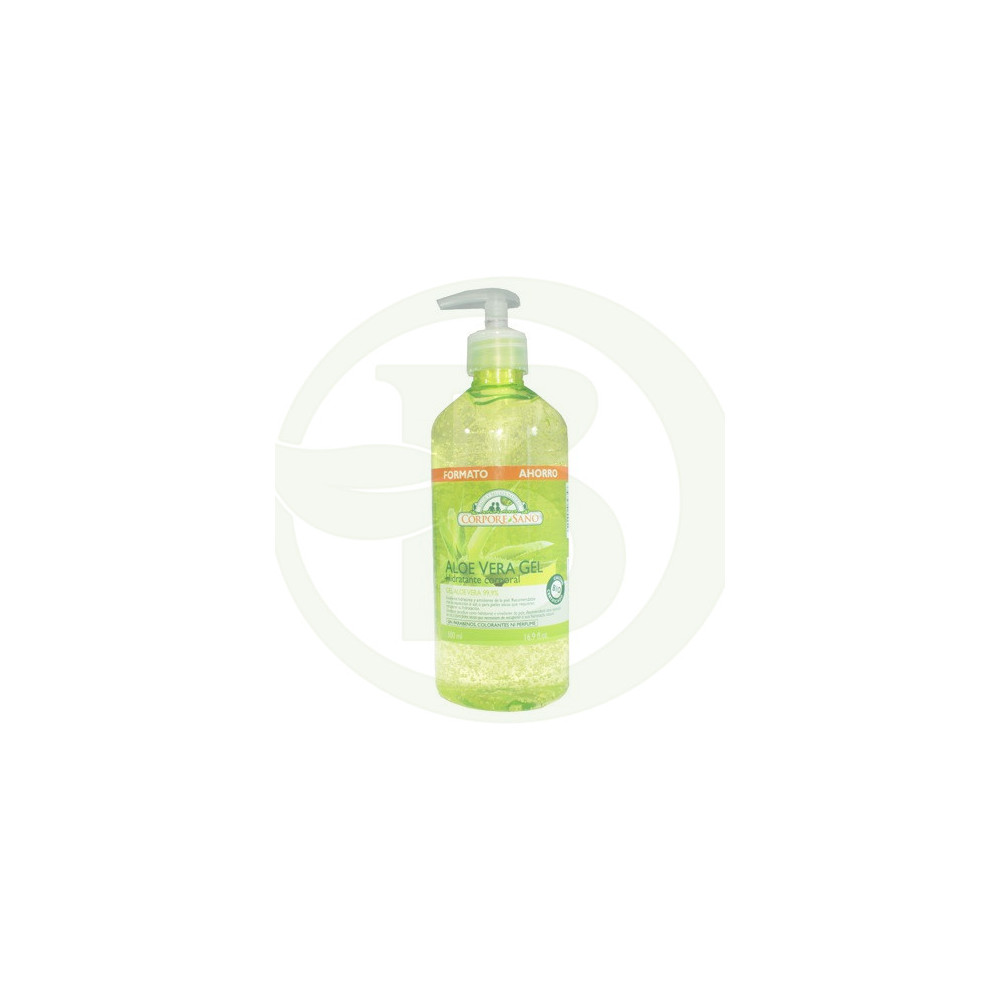 Gel Aloe Vera 500Ml. Corpore Sano con una pureza de 99.9%, aporta propiedades emolientes e hidratantes, para uso de cuerpo, cara y cabello. Indicado para pieles secas.