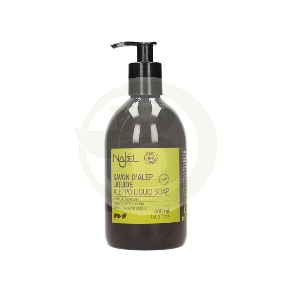 Jabón de Alepo lÃquido de Najel, recomendado para el cuidado de la piel de toda la familia. Se presenta en un cómodo envase con dosificador.