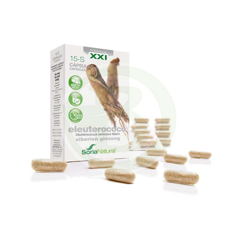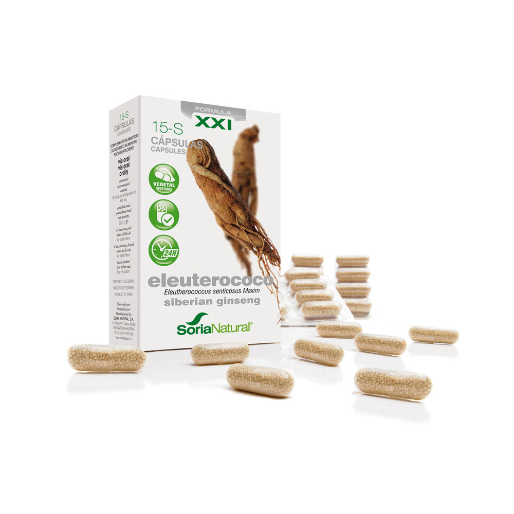 Cápsulas de Eleuterococo, conocida raÃz cuyo usa habitual en el sector dietético es como estimulante y energético natural.