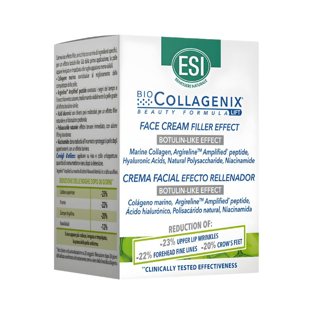 Collagene marino, peptide amplificato Argireline®, acido ialuronico (ialuronato di sodio e acido ialuronico idrolizzato), polisaccaride naturale, niacinamide, estratto di grano di Avena sativa, acetil esapeptide-8.