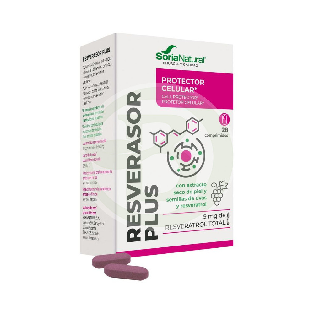 Resverasor Plus de Soria Natural contiene un gran efecto para proteger las células gracias al suplemento natural Resveratrol, presente en las uvas, que lo produce la planta para defenderse ante los ataques fúngicos, estimulando la producción de antioxidantes.